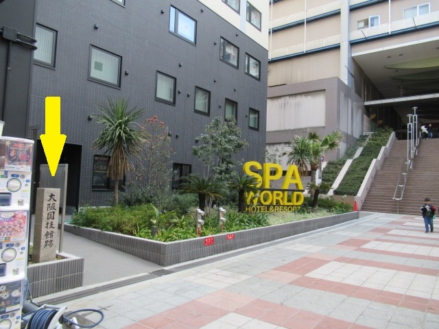 通天閣南本通りを南へ突当りの東側(左側)に大阪国技館跡の碑が建っています。1878年(明治11)には大阪相撲協会が設立されるなど江戸とならんで相撲の興行は盛んで、1919年(大正8)に東京両国の国技館に対抗してドーム式の大阪国技館が建設されています。