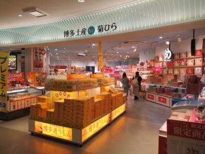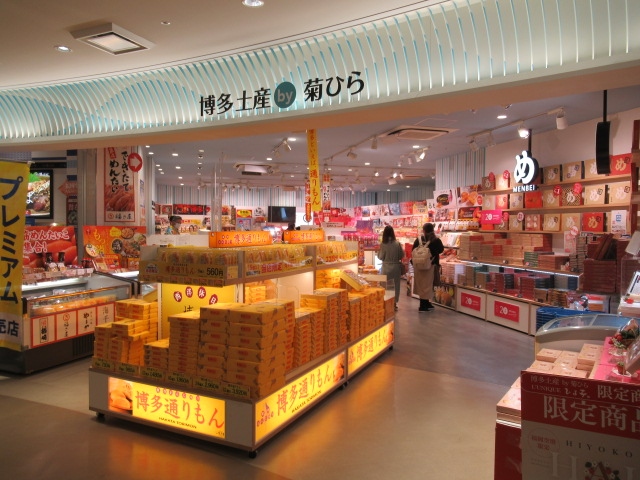 福岡空港国内線ターミナル2階、南側出発保安検査場の側に「博多土産 by 菊ひら」があります。明るい店内には博多土産の定番 "通りもん" "めんべい" をはじめ、福岡県産 "あまおう苺" を使用したお菓子や、人気の明太子・博多ラーメン、他では手に入らない当店限定商品である銘菓ひよ子と当店のコラボ商品である「ひよ子ハル」など豊富に取り揃えています。