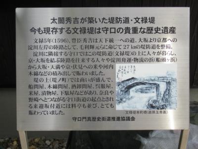 文禄堤は安土桃山時代の文禄5年に豊臣秀吉が毛利輝元たちに命じて、淀川左岸に京都と大坂を最短で結ぶ陸路を整備しました。これが京街道(大坂街道)と呼ばれ堤防道の文禄堤が造られました。長さは約27㎞あったと言われていますが、淀川の改修等で現在はここ守口にのみ当時の面影を残しています。