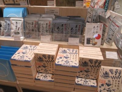 木の温もり感がある店内には名店の木札がずらりと並んでいるのが印象的で、さすが百貨店です。福岡名店の豊富な品々、一番目についたのは福さ屋さんの明太子、幟がありました。そして「茅乃舎のあごだし」も最高の土産。個性がある店舗で覘いてみましょう。