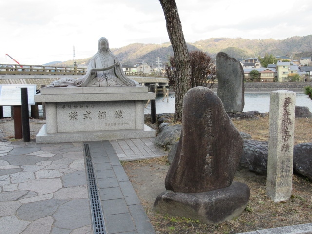 園内には、宇治市内にある源氏物語「宇治十帖」を象徴するモニュメントが設置されを設けています。そして、ヒロイン「浮舟」と「匂宮」が小舟で宇治川に漕ぎ出す姿を表現しています。ロマンですね。