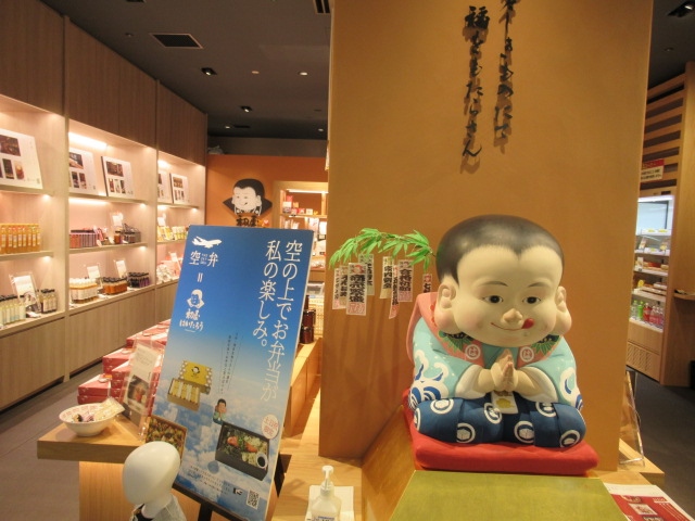 国内線ターミナル2階の中央エレベーター、エスカレーターの向かい側に「初屋はかたろう」があり、店先で「はかたろう人形」がお出迎え。落ち着いた雰囲気の居心地の良い店内は開放的で商品の品揃えが外からでも店内の様子がわかるディスプレイ効果もあります。