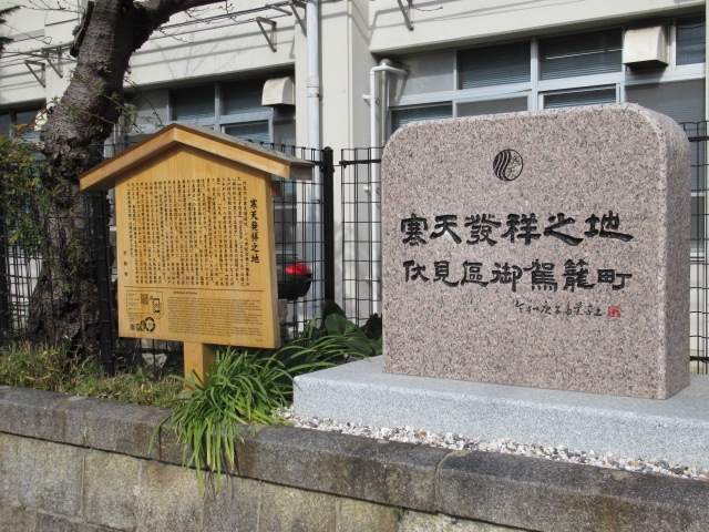 京都伏見には多くの史跡が残っていて「伏見薩摩藩邸跡」を見に行こうと思い歩いているとこの「寒天発祥の地」の石碑と駒札がありました。伏見区役所の通りを北へ突き当りにある伏見中学校の前になります。