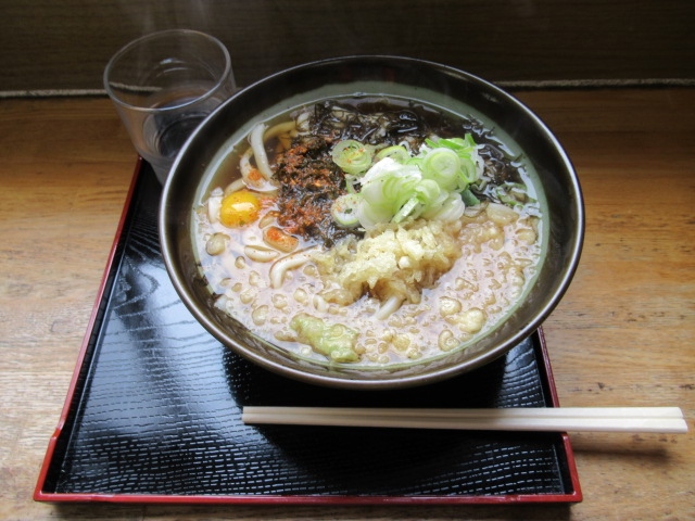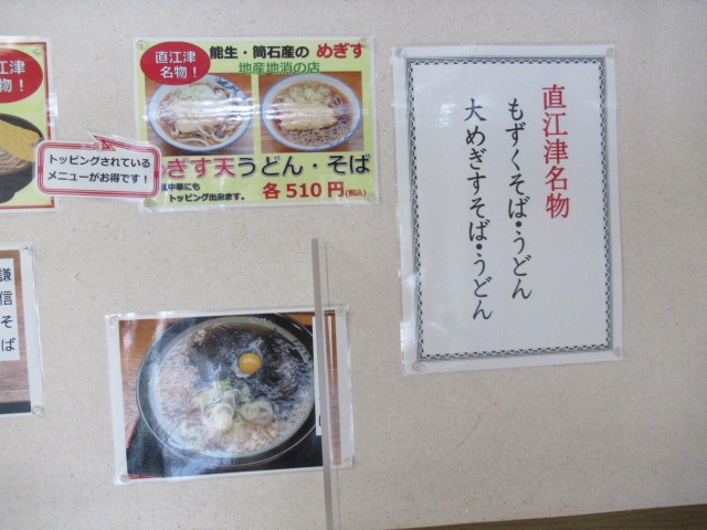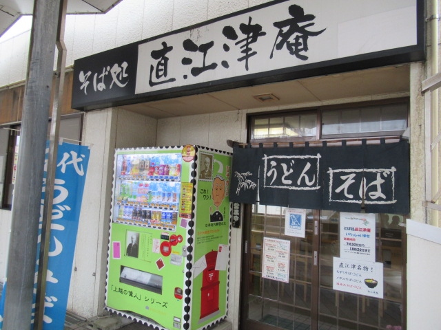 するとこの直江津庵を見つけました。そばうどん屋さんです。直江津名物と書かれた「もづくうどん」450円を注文(自販機でチケット)しました。お母さんがやってくれたうずらの卵や天かすのトッピグ付きです。もづくうどんは初めての経験でしたが舌触りが良くなめらかで出汁も美味しいかったです。