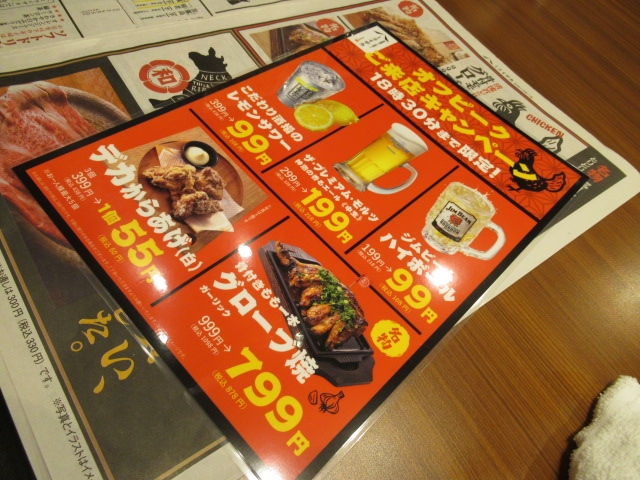 このような状況なのであまり繁華街の方へは出ずホテルの近くにあった店に入りました。ハイボール99円は嬉しくて気分が良いです。