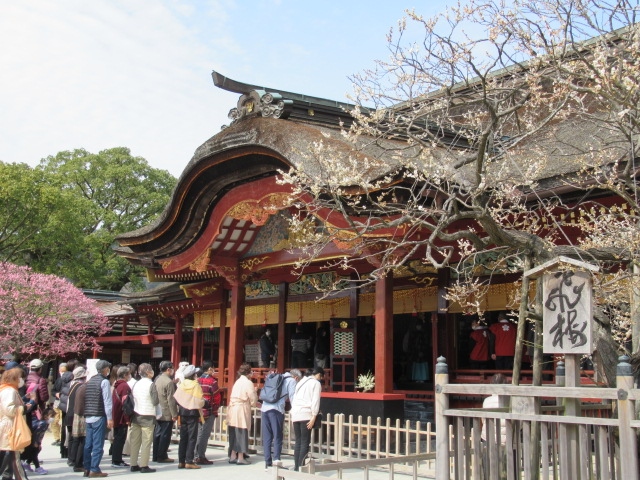 九州で最も参拝者が多く人気がある大宰府天満宮に行ってきました。この日は25日で聞くところによると「天神さんの日」と言うことで参道ではよもぎ入りの梅ヶ枝餅を販売していました。私も1個いただき何となく御利益を授かったようです。
