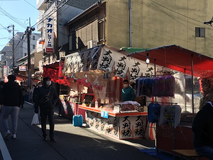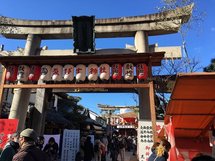 コロナ禍の中での初詣は密となり今年は日を遅らせた初詣になりました。京四条通を東へ歩いていると大和大路には露店が並んでいる姿を発見し早速つられてこの先には何があるのだろう、と思いながら歩いていると、そうです「ゑびす神社」です。