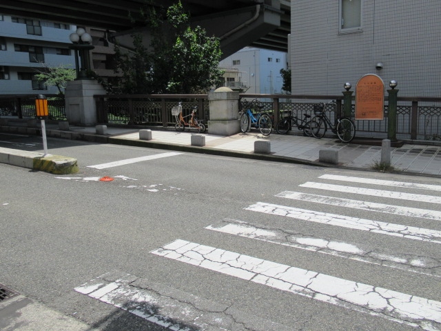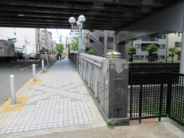東詰付近は当時南瓦屋町と言われ瓦の窯や土取場があり瓦生産が行われ堀川には船着き場があり大変賑わっていたようですがその姿は今は見られません。鉄製になったのは昭和7年(1932年)で昭和41年に架け替えられ現在に至っています。歩道もでき丈夫な橋になっています道頓堀まではもう少しさらに進みましょう。