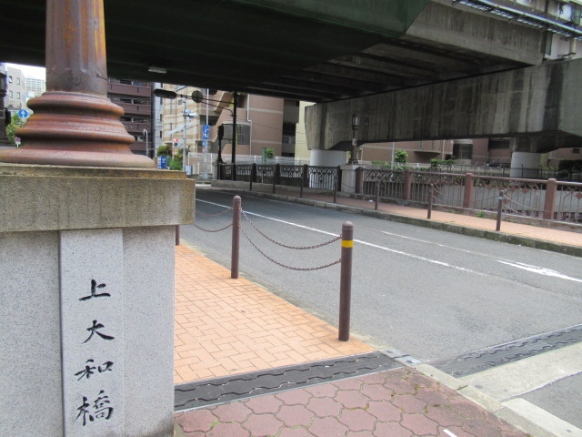今回は東横堀川に架かる14の橋を全て制覇しようと張り切っています。くだらない?と思う人もいるかもしれませんが、くだらないことを実行するのも良いでしょう。そして葭屋橋から散策しここ「上大和橋」で14ヶ所すべて制覇しました。堀川はここから西へとカーブし道頓堀になります。
