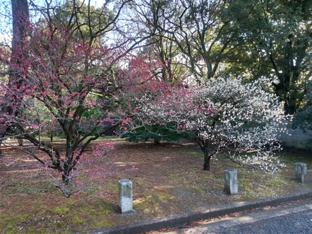 御苑内中央付近で見つけたのが梅でそれもピンクとホワイトのセットで咲いていました。ちょっと早咲きでおちょこちょいの梅でしょうか、また近くにはロウバイも咲いていて早速写真撮影です。今から良い時期になります都会の騒音もなく散歩を楽しんでください。