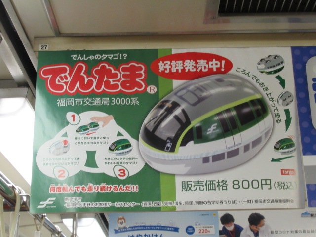 そこで発見、写真を見てください「でんたま」です。何回転んでも走り出すタマゴの形をした電車でお土産の最適です。福岡限定なのでしょう。