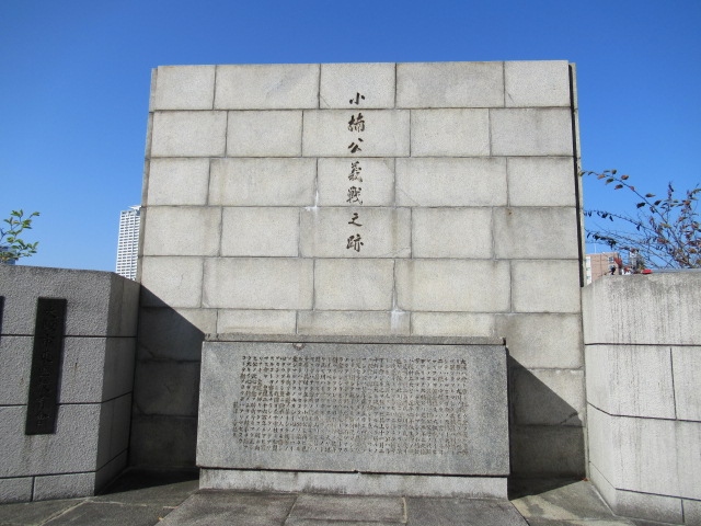天満橋駅から北浜駅まで大川沿いにある八軒家浜の遊歩道を歩きました。秋晴れの穏やかな大川を眺めながら歩いているとこの小楠公義戦之跡が建っていました。
