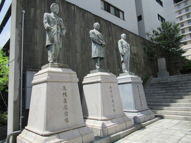 大阪には五代友厚の像はよく見ますがこれは大阪商工会議所にある像です。商工会議所の南側に建っていて正面道路側を向いているのではなく横を向いているって感じです。五代友厚は江戸時代末期から明治時代中期にかけての実業家で大阪の発展に尽力された方として有名です。ここには他に土居通夫君像と稲畑勝太郎君寿像も並び実業家ぞろりでここに建っている意味が良くわかります。立派な石造です。