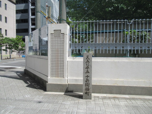 葭屋橋からスタートし今橋へそして橋だけではなくちょっと寄り道し今橋から西へ開平小学校前にこの石碑があるとの情報から立ち寄りました。石碑に書かれた「天五に平五 十兵衛横町」から昔あった横町の名前かな?と思うのですが、後で調べ判明しました。
