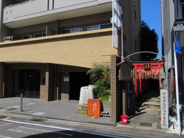 「丹波国亀山藩京屋敷跡」は松原通室町を西へ入った北側にあります。マンション「メロディーハイム松原」の東隣「白滝・花月大明神」の前に建っています。