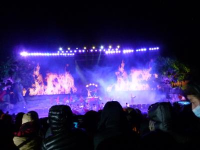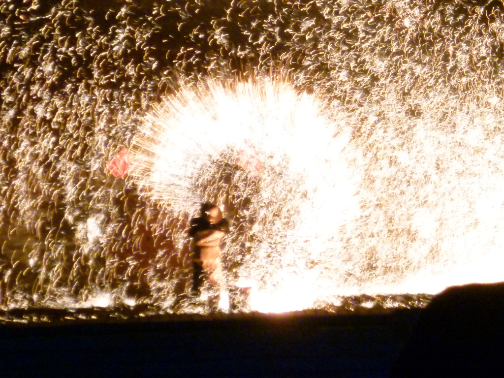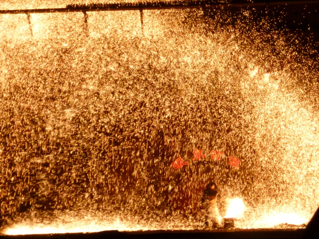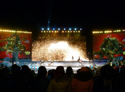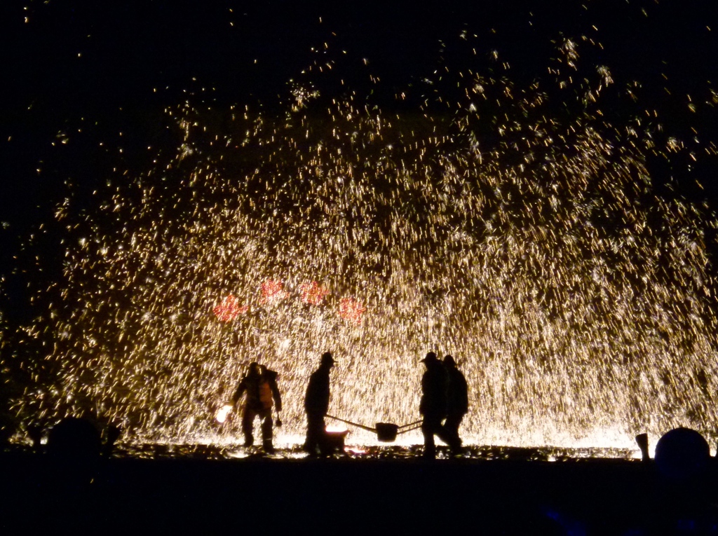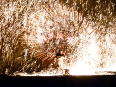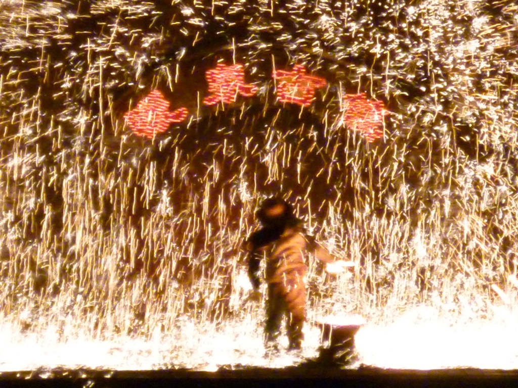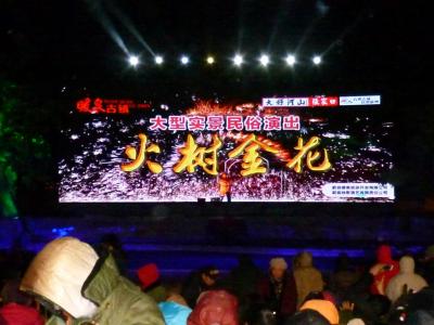 北京から八達嶺長城を越え高速道を西へ約5~6時間走り張家口・蔚県にある「暖泉古鎮」に到着です。ちょうちんで飾付をした通りのちょっと入った一角に劇場があり、ここで年に1回、旧正月にこの花火の祭典「打樹花」(ダーシュファー)は行われます。始まりは「花火が高級品で金持ちだけが楽しめる娯楽だった頃、村の鉄工職人が液体鉄を建物の壁に向かってまいたところ見事に美しい花となった」ことが始まりのようです。日本でもTV番組で紹介されましたね。気温は氷点下10℃以下でしょう。寒さを忘れるくらい感激しました。近くには土やレンガ造りの集落「西古堡」があり日本にない光景を堪能できました。