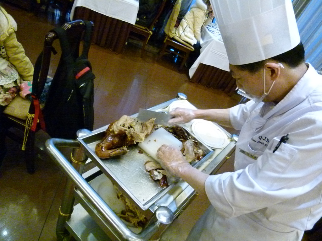 北京にやってきました。北京と言えば「北京ダッグ」ですね。早速もっとも有名で口コミが多いこの店「全聚徳 (王府井店) 」で食事をします。たぶん混んでいるだろう、と思い17時ごろの入店で正解です(帰りはものすごく混んでいました正解)もちろん北京ダッグを注文です。直ぐそばでスライスしてくれます。日本とは違って皮だけではありません。ハーフを注文しましたが、頭もハーフできました。カラッと揚がって美味しかったですね。ちょっとお高いですね。こんなもんでしょう。。。