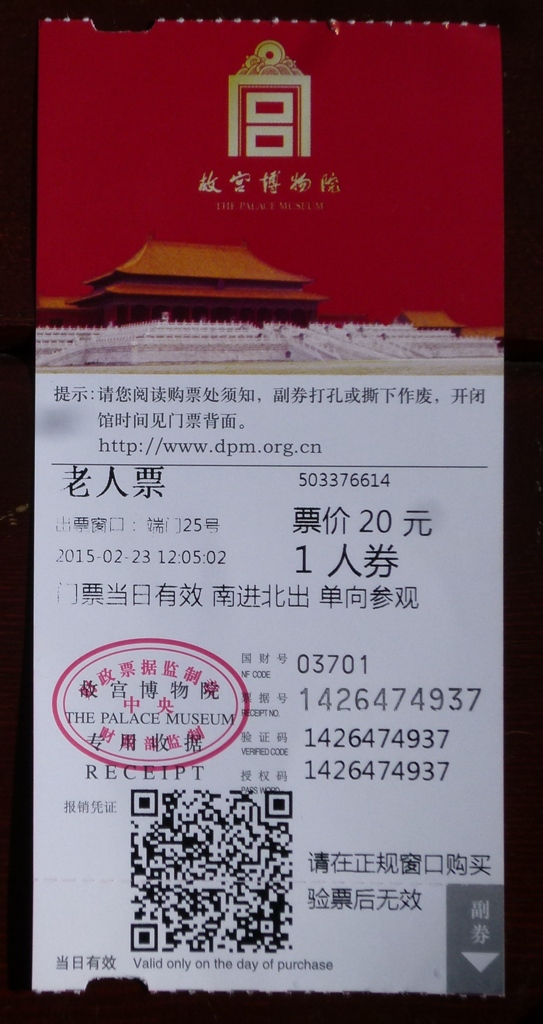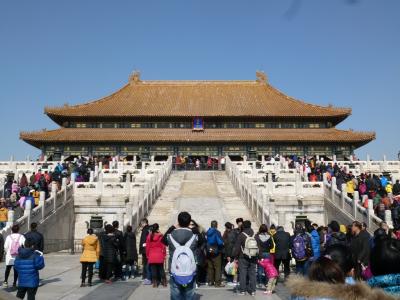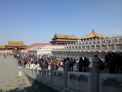 北京の最大の観光地である「故宮博物院」入ります。ここは数年前に来ましたがその時は修復中だった記憶があります。にも関わらず人は多かったです、今回もさらに大勢の人が押しこんできています。観光は一方通行となっており、南側の午門(天安門側)から入り北側の神武門(景山公園)へ抜けますが、所要時間は最低2時間ぐらいは必要でしょう。なので出口から帰りのことを考えなければなりません。バスが頻繁にありますが乗車しにくく地下鉄を作って欲しいです。60才以上は生年月日記載のパスポート提示で半額です。やったぁー。