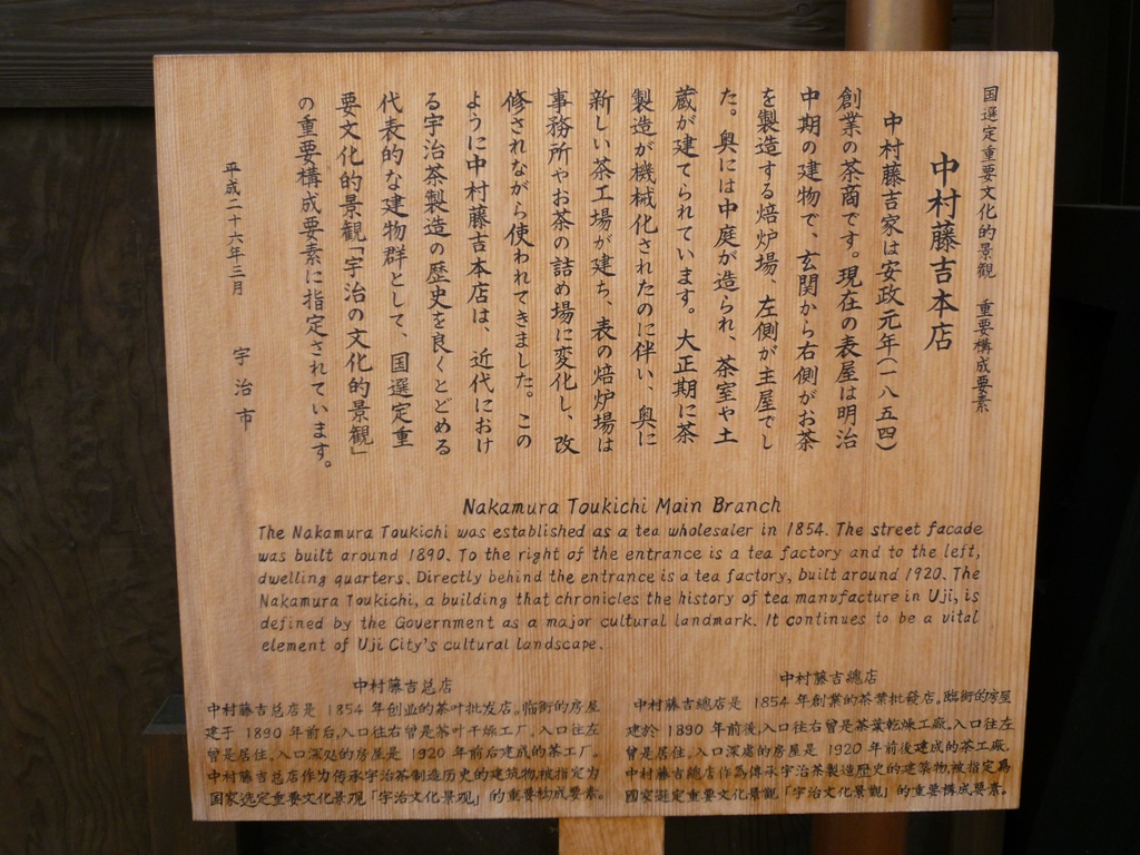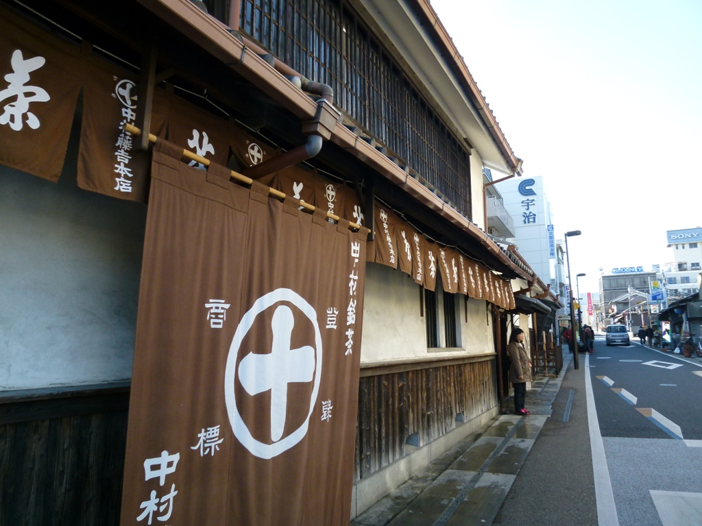 JRの宇治駅を降りると直ぐ眼の前に「宇治橋通り商店街」の入口があり、ここを突き当たったところにお茶で有名な老舗の「中村藤吉 」の本店があります。十字のマークが目立ちますので直ぐわかります。中に入るとお茶の良い香りが、ぷ~ん、とします。まさに本場の店に来た感じがしますね。お茶葉はもちろん、抹茶を材料にしたカステラや羊羹など様々な商品を販売しています。宇治土産には最適です。