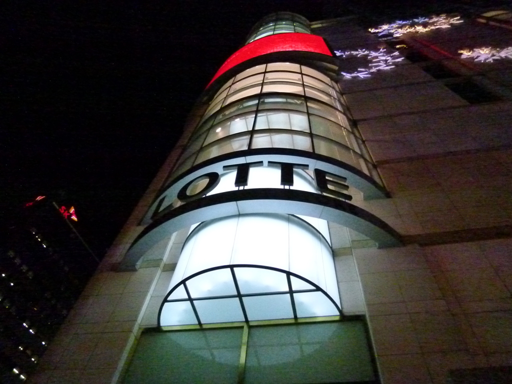ソウルの最大の繁華街の明洞にある「ロッテ百貨店」です。夕刻時期に立ち寄ったのですが、館内は人・人・人です。明るい店内は活気がありますね。ちょっと通路が狭く感じます。日本人とわかるのでしょうか、片言の日本語で呼込み声が飛んできます。うまくかわしましょう。品物の値段は市場に比べ高額ですが安心できますね。外装に年末とクリスマスを意識しネオンがギラギラで綺麗でしたよ。是非夜の訪問をおすすめします。