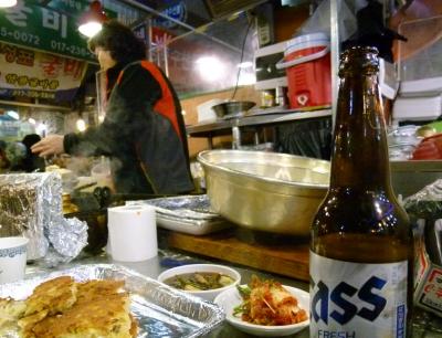地下鉄で「鍾路5街駅」下車8番出口を出て真直ぐ歩き左手にあります。とても活気があるとの情報だったので行ってきました。ソウルには、南大門市場しか行ったことが無く、それとの比較になりますが、通路は狭く、さまざまな店でゴチャゴチャ、これが良いですね。本当の市場ですね。小さい頃の田舎の市場を思い出します。韓国のり16袋4000W、味見し最高に美味しいタコキムチ(ニンニク入)を購入しました。南大門より安いのでしょうか。寒い中、冷たいビールで天ぷら夕食です。大変楽しく買物食事することができました。