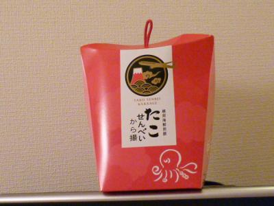 ここは羽田空港、今回はANAに搭乗します。たくさんの土産屋さんが並んでいます。今回は、ここ「東京食賓館」でおつまみにと「たこせんべい」を買いました。もちろんビールのアテにおつまみです。箱の中にはタコの姿が残った、食べやすい大きさでちょっぴり効いた味付けで最高のおつまみでした。