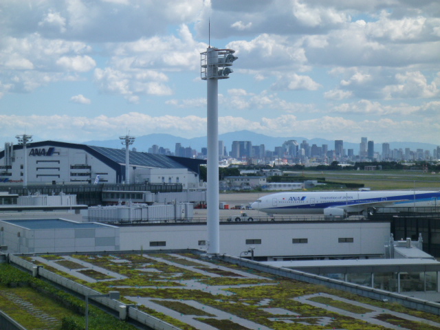 出発の待ち時間があったので展望台へ登ってみました。あまり大きくない空港なので、簡単に展望台まで行けます。滑走路が眼の前に見えます。JALとANAの飛行機でいっぱいです。展望台は緑地化されていてゆったりできます。とどもたちの姿もちらほら、良い眺めです。