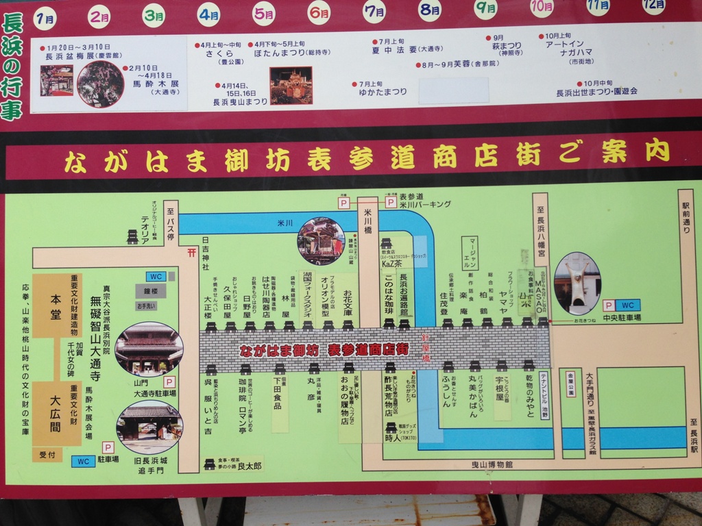 「長浜大手門通り商店街」は、JR長浜駅下車、駅前大通りの一本北隣りのアーケード街です。商店街には、飲食店もちろん、饅頭屋さんやお茶屋さん多くの老舗が集まっています。また、曳山博物館など見どころも多く、なかなか楽しい商店街です。食べ歩きもなかなかいいものです。