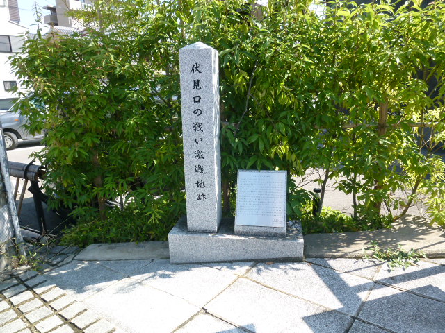 この伏見は今も昔の町家や街並などが残るところです。この付近京橋は、江戸時代、京への高瀬舟、大坂や宇治への輸送船で大変にぎあう伏見の中心でもありました。ここで激戦がありましたが、今は石碑のみです。直ぐそこに「寺田屋」や水郷のほとりに「龍馬とお龍 愛の旅路 像」などが見れます。「小倉山荘」の駐車場横にあります。