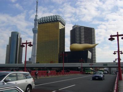 今回は、東京「浅草」付近を散策しました。天気にも恵まれ、1月とは思えない暖かい気持ちいい日になりました。ここ隅田川沿いを散策していると、変な建物が見えます。TVなどで観たことがありますが、これは何でしょう? 雲が流れたような形です。TVなどで観たことがあります。アサヒグループ本社ビルですが、スカイツリーの眺めよし、浅草寺付近で、最高の場所に建っていますね。