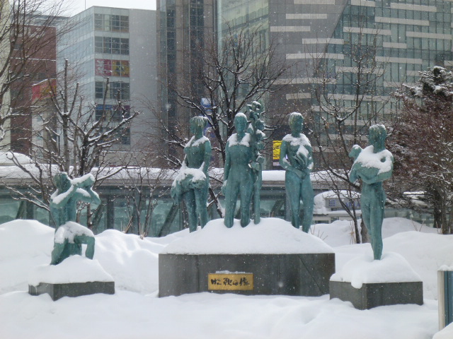 さっぽろ駅は、綺麗な駅です。ここ南口も広く開放的、しかし雪が積もっていてガラ―ン。「牧歌の像」が眼にとまりました。雪の上を歩くのは慣れていません。雪が溶ける時期には祭や催し物、ビアーガーデンがあるのでしょうかね。