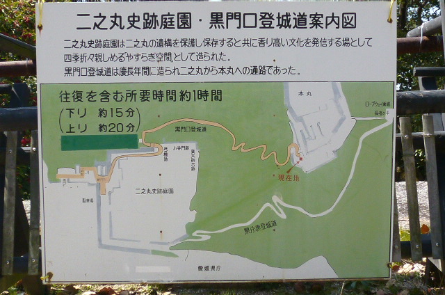 松山城へはロープウエイで登り、そこから二の丸へ行ってきました。失敗です。なんと天守閣から二の丸庭園までが遠い遠い、それも急な下りでした。二の丸庭園へ行くなら県庁側から行った方が良いですね。そして天守閣へそして東側へ抜けた方が良いかも知れません。
