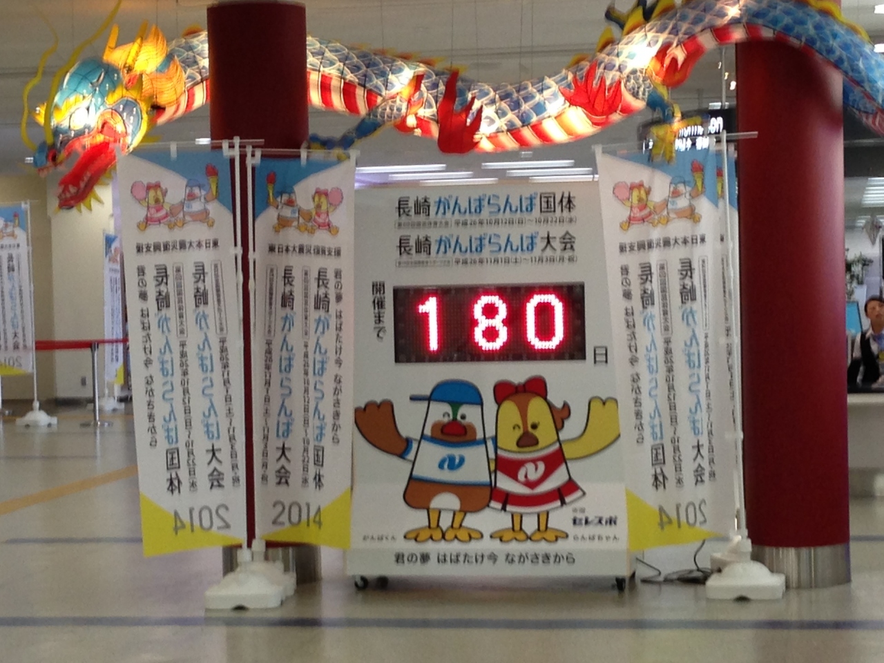 久しぶりに長崎空港へ来ました。市内までちょっと時間かかるようです。小さい空港なので投機までの歩く距離が短いのが利点ですね。売店は土産物を購入している観光客でいっぱい。今年に国体があるのでしょうか。掲示板がありました。この秋には更に観光客が増え、にぎあうことでしょう。