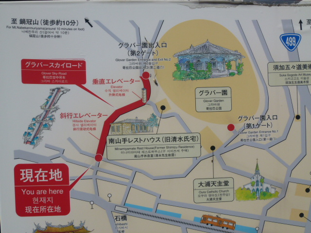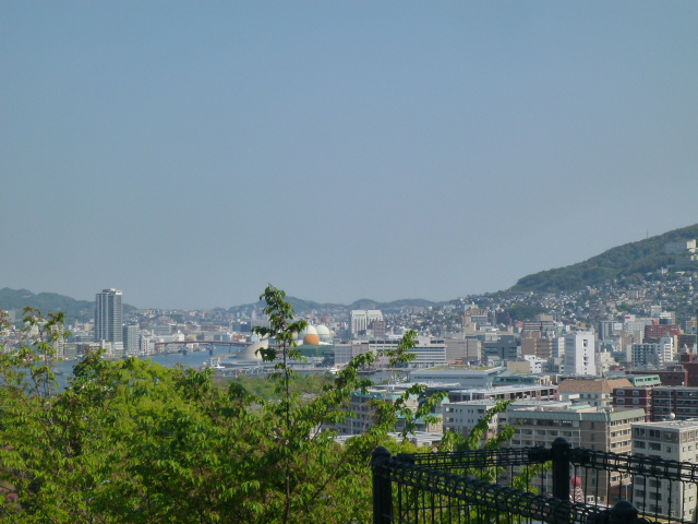 グラバー園へは、路面電車の「大浦天主堂下」側から行く方法が一般的だと思いますが、いやいや、「石橋」駅から坂道を登って、「グラバースカイロード」からグラバー園の頂上から下りながら、見学する方法が良いですね。傾斜に沿ったエレベーターで登ります。また違った市街地や景色を見ることができます。無料です。