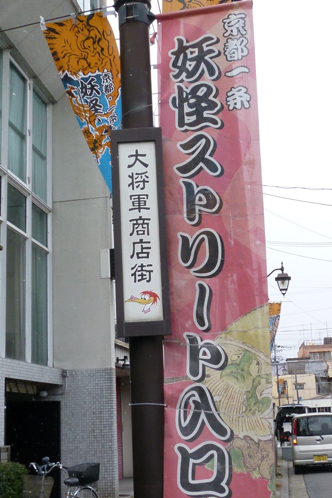 ここは「大将軍商店街」それとも「妖怪ストリート」? 良くわかりません。同じところかな。各々の店にあった妖怪を作り店前に展示しています。内容は説明しにくいので写真を見て下さい。なんだか気持ち悪い妖怪もいましたよ。お客来るのかなぁー、心配です。この一条通りは昔から妖怪が良く出ていた、との伝説があるようです。