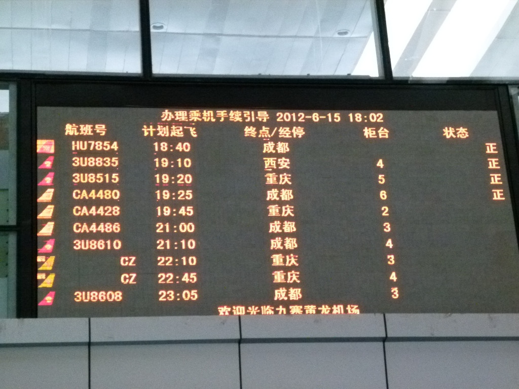 今回の中国旅行は成都です。ここから日帰りで「九寨溝」を往復しました。その玄関口がこの「九寨黄龍空港」です。小さな空港で何もありません。高所にあるためか運航料金は高額です。また、地理的に気象条件が悪いので運航スケジュールの乱れが良くあるようですが、午後からの雨にもかかわらず遅れることなく無事往復することができました。