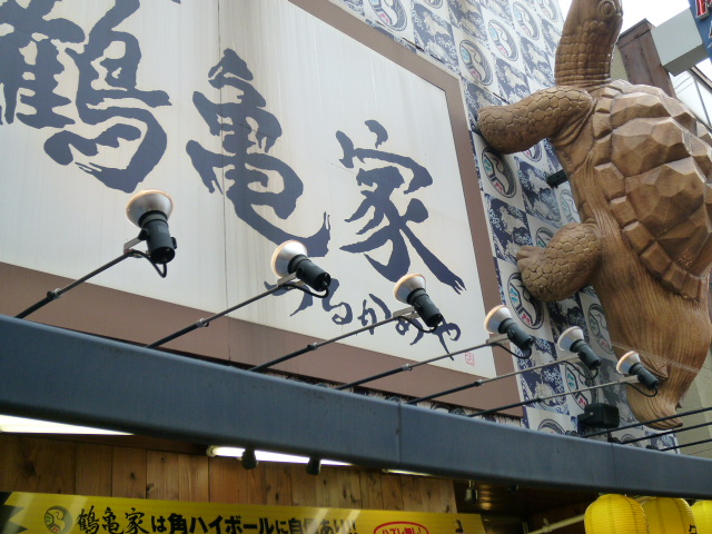 大阪名物は「たこやき」「お好み焼き」などありますが、「串カツ」も名物です。特にここ通天閣付近には串カツ店は多く、どの店も繁盛しています。わたしもお腹がすいたのでここ「鶴亀家」に入りました。とにかく、おいしい、やすいです。もちろんソースの二度付け禁止ですからね。焼酎のお湯割りで乾杯です。