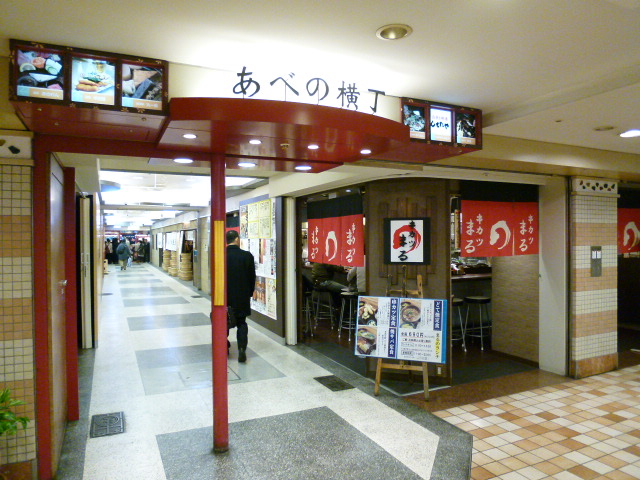 あべちかの北方向「あべの横丁」の角にあります。あたらしい阿倍野の「あべのハルカス」を散歩し、腹が減り、地下街の店をキョロキョロ見ていると。「串カツ屋のまる」お客はサラリーマン風の数名とテーブルに家族ずれ、美味しそうに食べていたので私も串カツセットを注文、お湯割り含めて1000円でいただきました。休憩できました。さぁ出発です。どこへ行こうかな。
