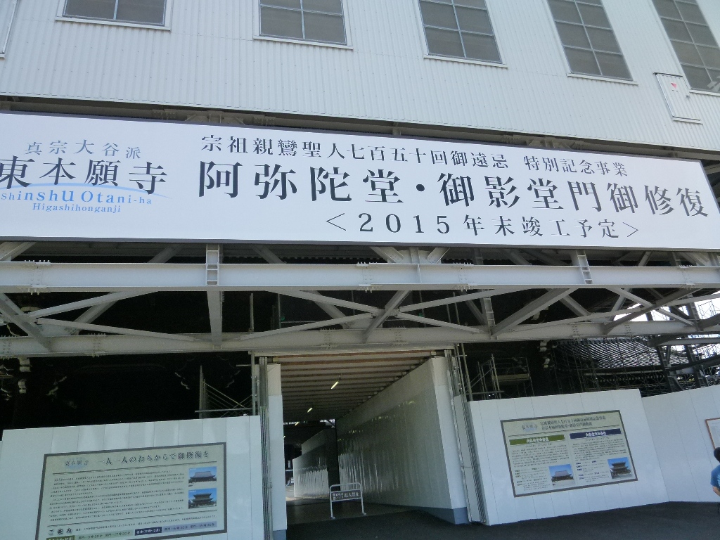 でかい寺院です。京都駅から京都タワー方向の北へ進み徒歩10分くらいの左側にあります。門前には大型バスも駐車できる駐車場があり、また道が一部広くなっています。しかし、残念です現在一部修復中で全体がみれません。また、次の機会を待ちます。