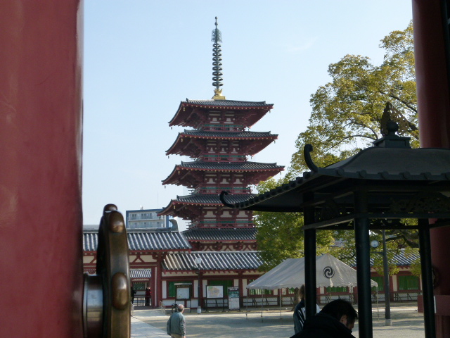 聖徳太子創建の四天王寺内に五重塔はあります。この五重塔は、台風や戦災による被害を受け、現在の塔は1959年の再建された塔です。近年の建築ですが、見事に飛鳥時代の姿を再現しています。見ごたえある素晴らしい塔です。庶民の信仰の場として活用されています。
