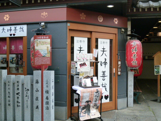 道頓堀商店街と千日前の間にあります。標識がありますが、歩行の人でいつも混雑していますので、見逃さないように注意ください。昔、関西の番組でミヤコ蝶々、南都雄二の「夫婦善哉」でお馴染みだった記憶があります。境内には水掛け不動尊があります。