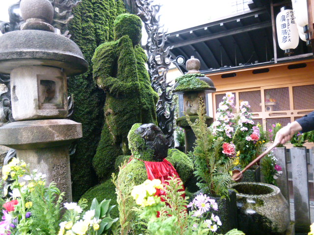 道頓堀商店街と千日前の間にあります。「法善寺」との標識がありますが、歩行の人でいつも混雑していますので、見逃さないように注意ください。有名な「法善寺」の境内にあります。名の通り、訪問者全員が水をかけていますので苔だらけです。また、これが良い色し良いですね。