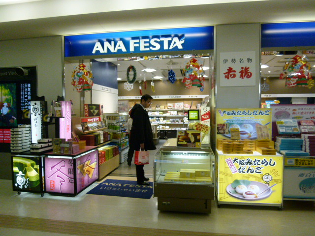 伊丹空港の南ターミナルです。北(JAL側)ではありません。出発口の前にあります。品々は豊富です。関西らしい、たこやきやお好み焼きなどのお土産が目立ちます。もちろん、EdyもANAカード(割引あり)使えますよ。