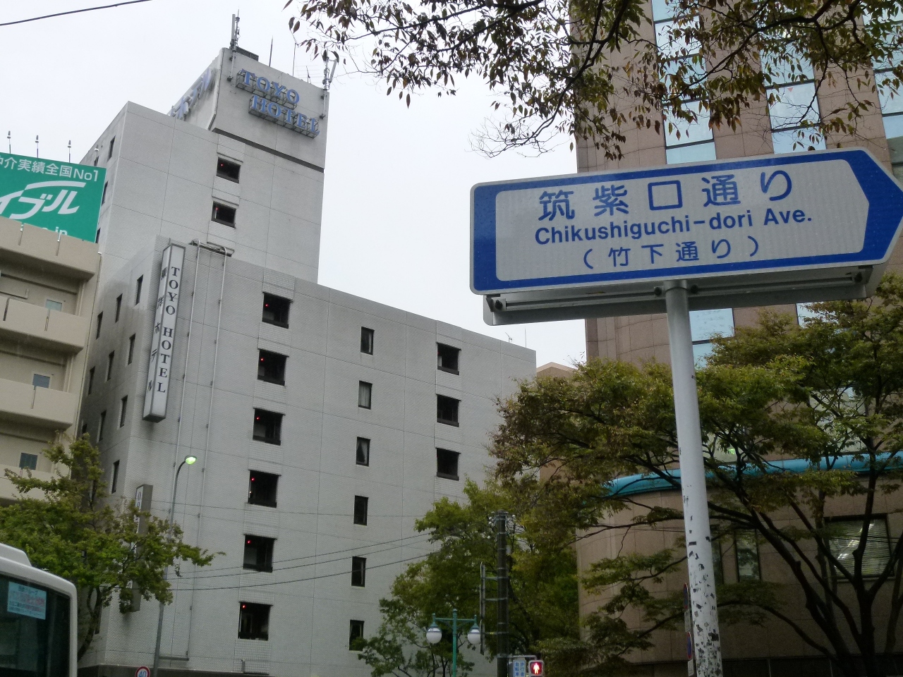 博多駅の筑紫口駅を出て、前の道を左に、交差点の向こう、横断歩道を渡ったところにあります。徒歩数分。こじんまわりしたホテルです。一人旅の泊るだけの人には充分です。また、残業に疲れ帰宅する力もないビジネスマンには最適でしょうね。