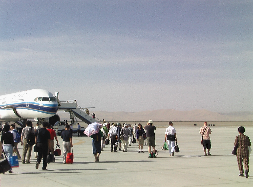 上海で乗換え、西安で乗換え、敦煌にきました。遠いですね。しかし、敦煌観光は、価値あるところですよね。空港は小さいですね。トイレも良くないし、売店ももうひとつです。土産屋など色んな事は、市街地やホテルで済ましておいた方がいいと思います。市街地から約30分です。