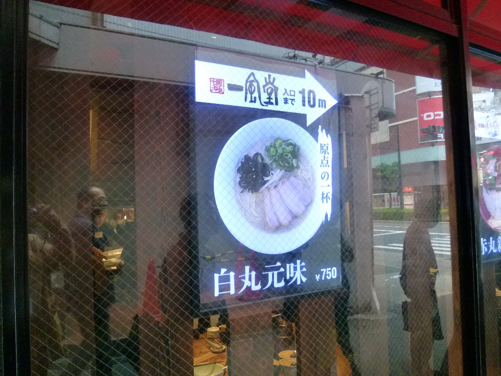 この付近一帯は飲食店が多く買物客やネクタイをしたビジネスマンでにぎあう場所です。10人は並んでますね。前もって注文を聞いています。ここ「一風堂」は言うまでもなく、博多の味とんこつです。白味元味、赤丸新味、どちらにしますか? 私は、白味元味にします。