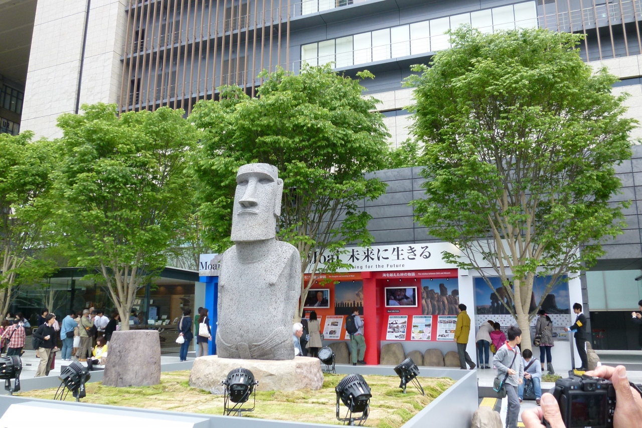 また、グランフロント大阪を訪問しました。前回来た時に確か、うめきた広場にモアイ像が展示されていたと思ったのですが、展示はありませんでした。その代わりに年末のイベントである、クリスマスの飾り付けをされていました。写真は、前回のモアイとその時いただいたバッチの写真です。