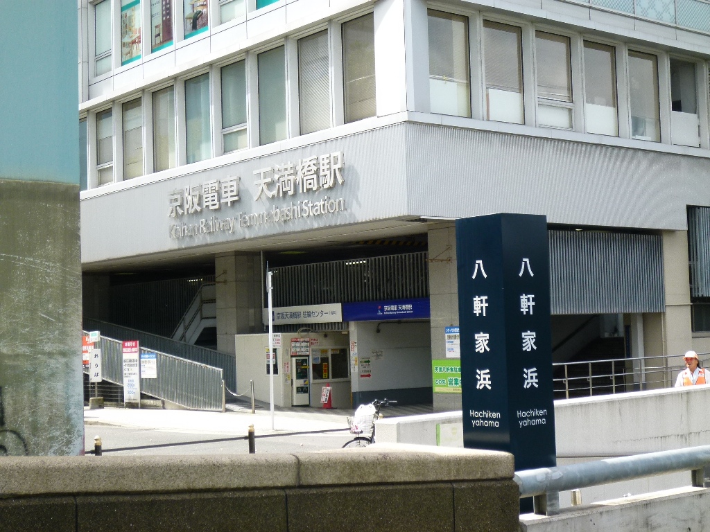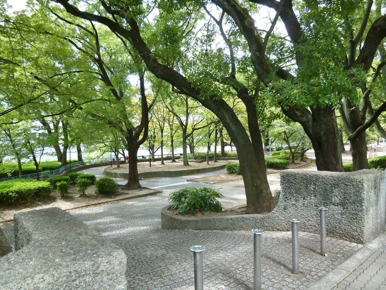 天満橋駅より大川を渡った北側に位置します。「天満青物市場跡」や「淀川三十石舟唄碑」などが残る公園です。また、テニスコートがありテニスをしている方もおられました。散歩する人、河川を眺めている人、庶民の憩いの場所ですね。
