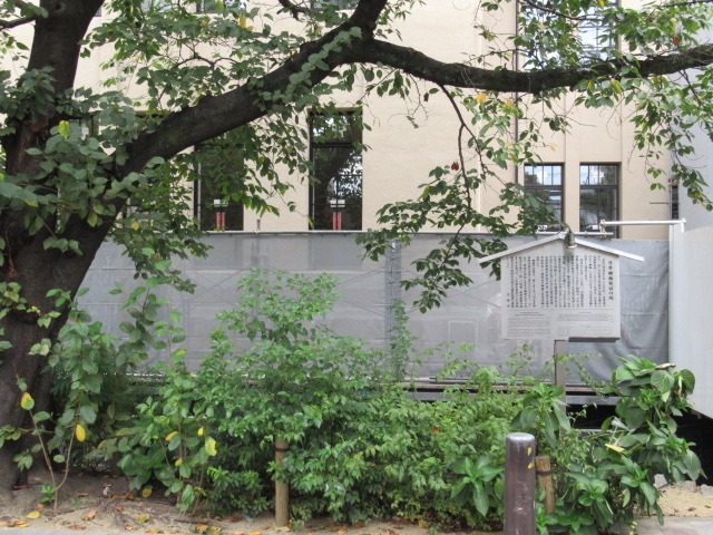 この「三条東殿遺址」は姉小路通烏丸を東に入った南側にあります。簡単に言うと新風館の敷地内北側にあり道路から見えます。といっても現在新風館は工事中でテント越しになります。写真見てください。