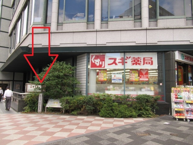 京都・河原町御池交差点の南西側の角にあるスギ薬局の左横にこの石碑はありますが、なぜか2つ描かれています。